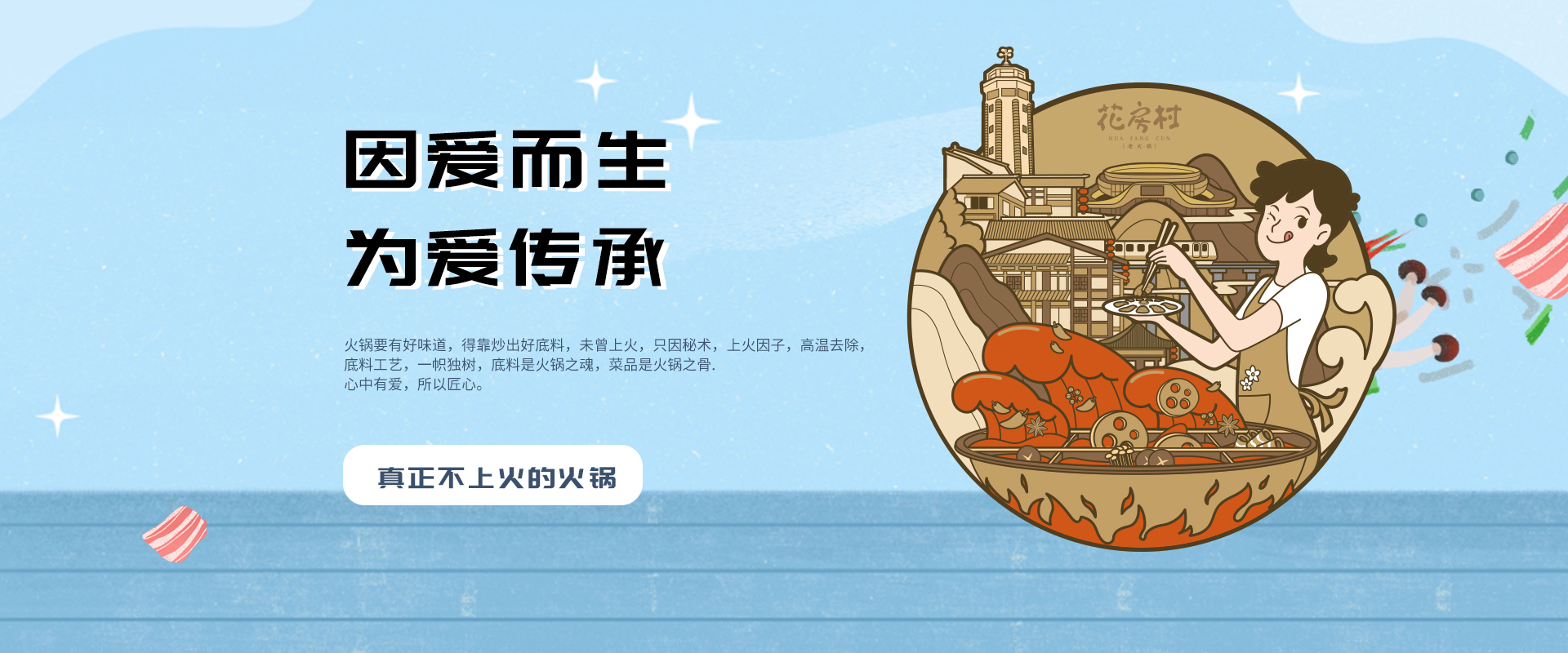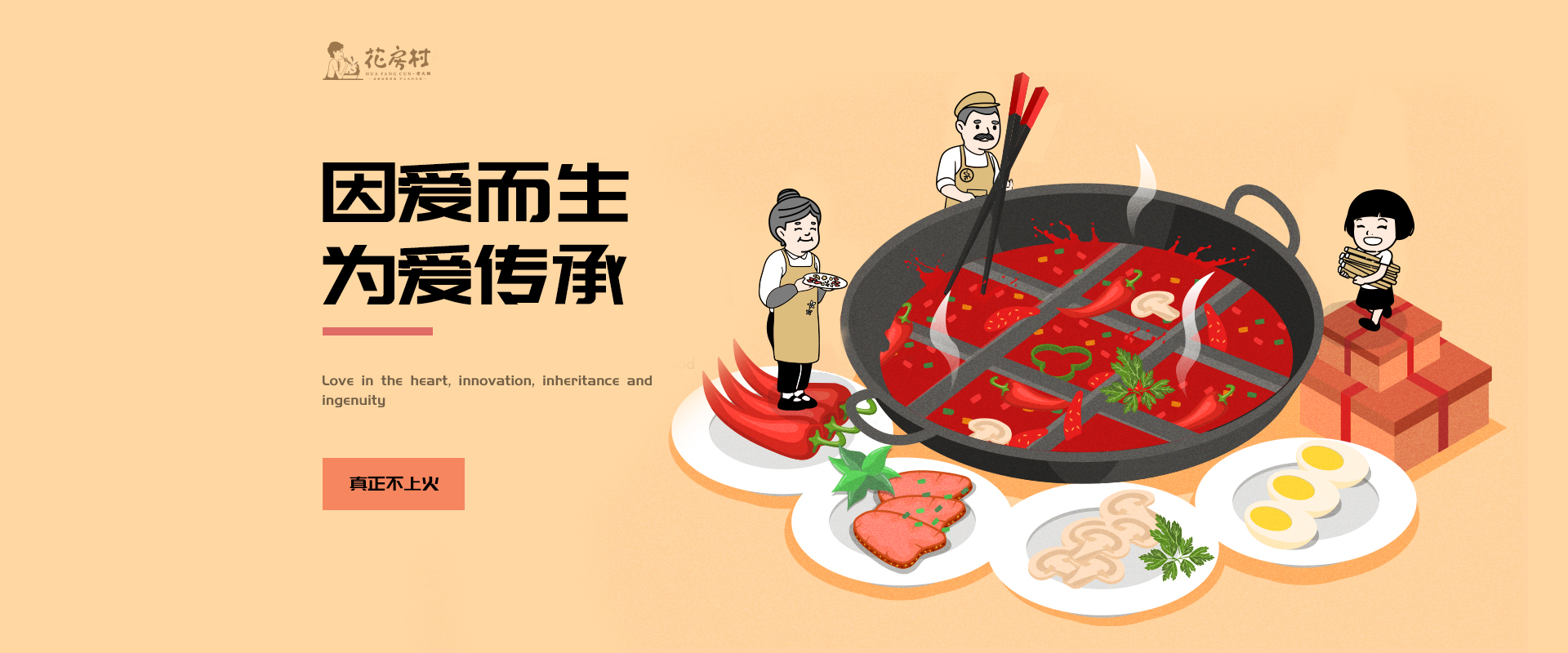 心中有爱,所以传承。立身之本,火锅之魂,火锅要有好味道,得靠炒出好底料,未曾上火,只因秘术,上火因子,高温去除,底料工艺,一帜独树,心中有爱,所以匠心。底料是火锅之魂,菜品是火锅之骨。